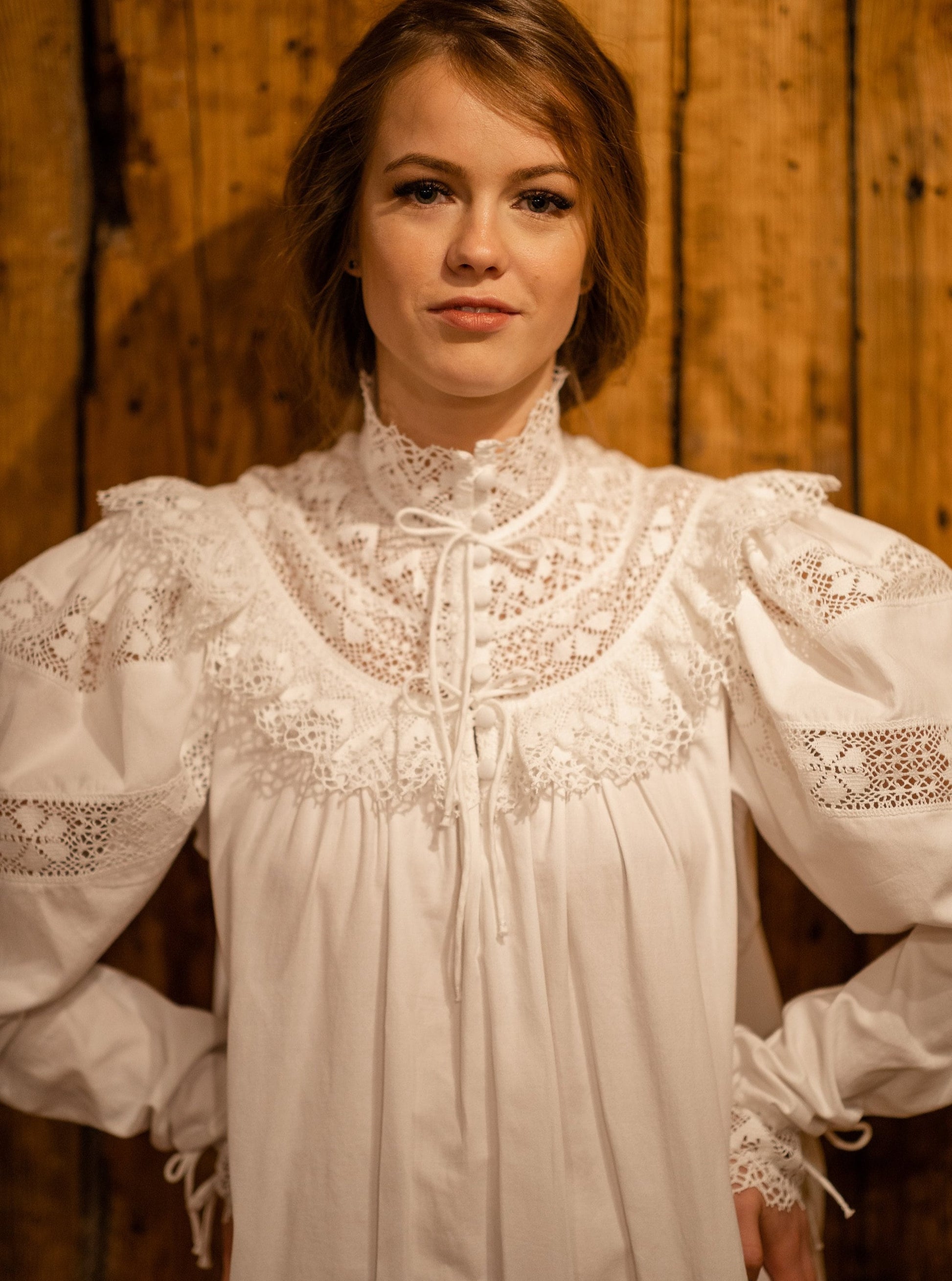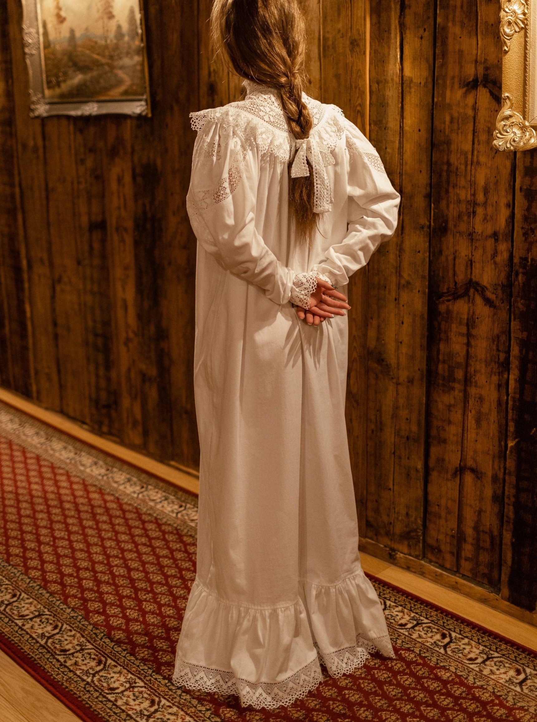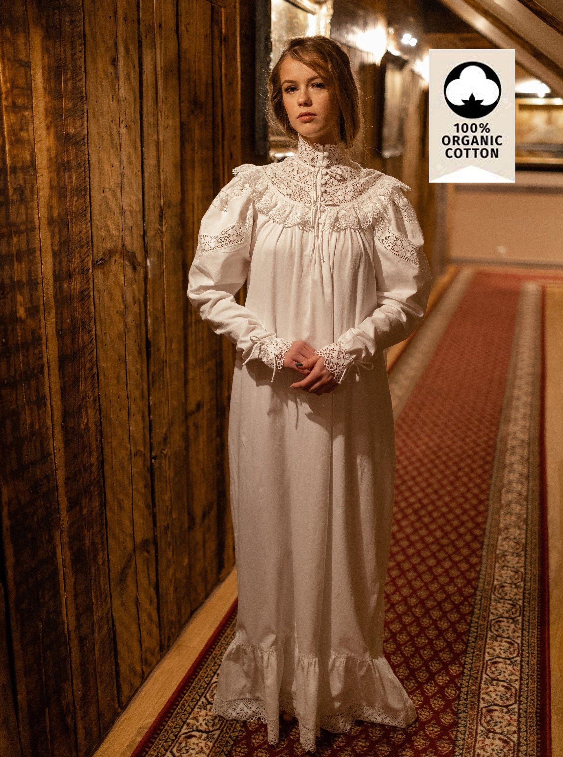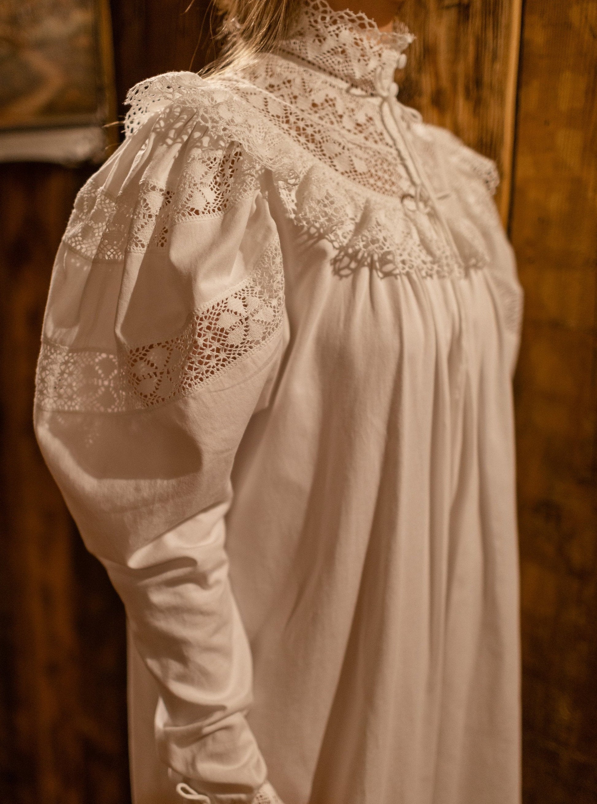 This beautiful soft sateen nightgown was inspired by Victorian Edwardian times around 1900’s. In those days during the grim and long English winter evenings women retreated in the luxury and cosiness of their long cotton nightdresses. Enjoying their favourite book in front of an open fire they emanated intoxicating fragrance of subtle feminine beauty and hidden sensuality.