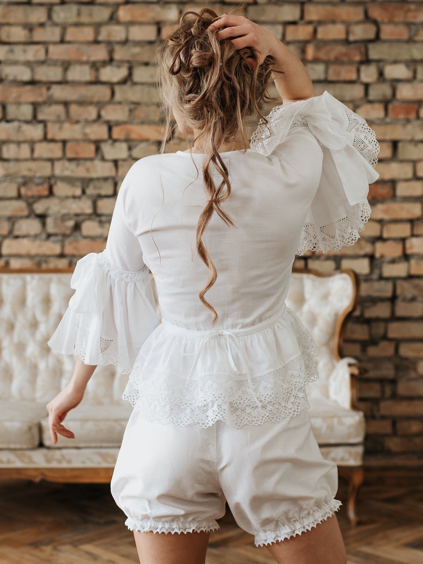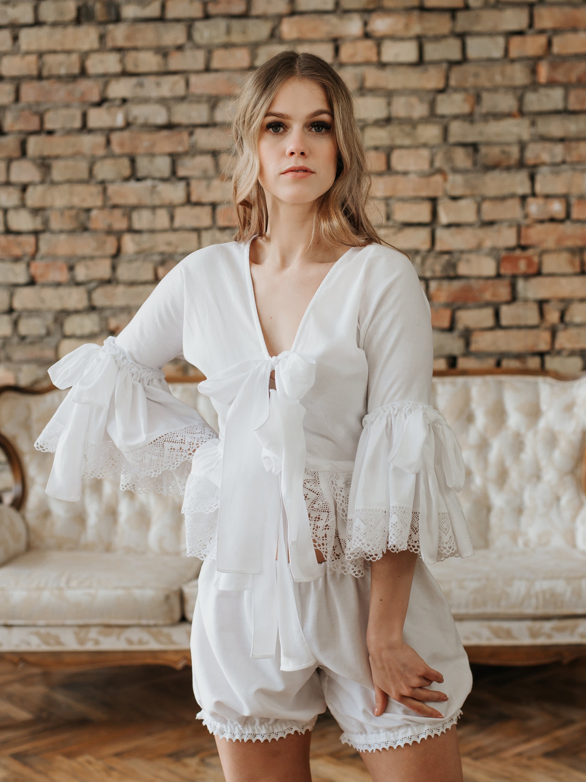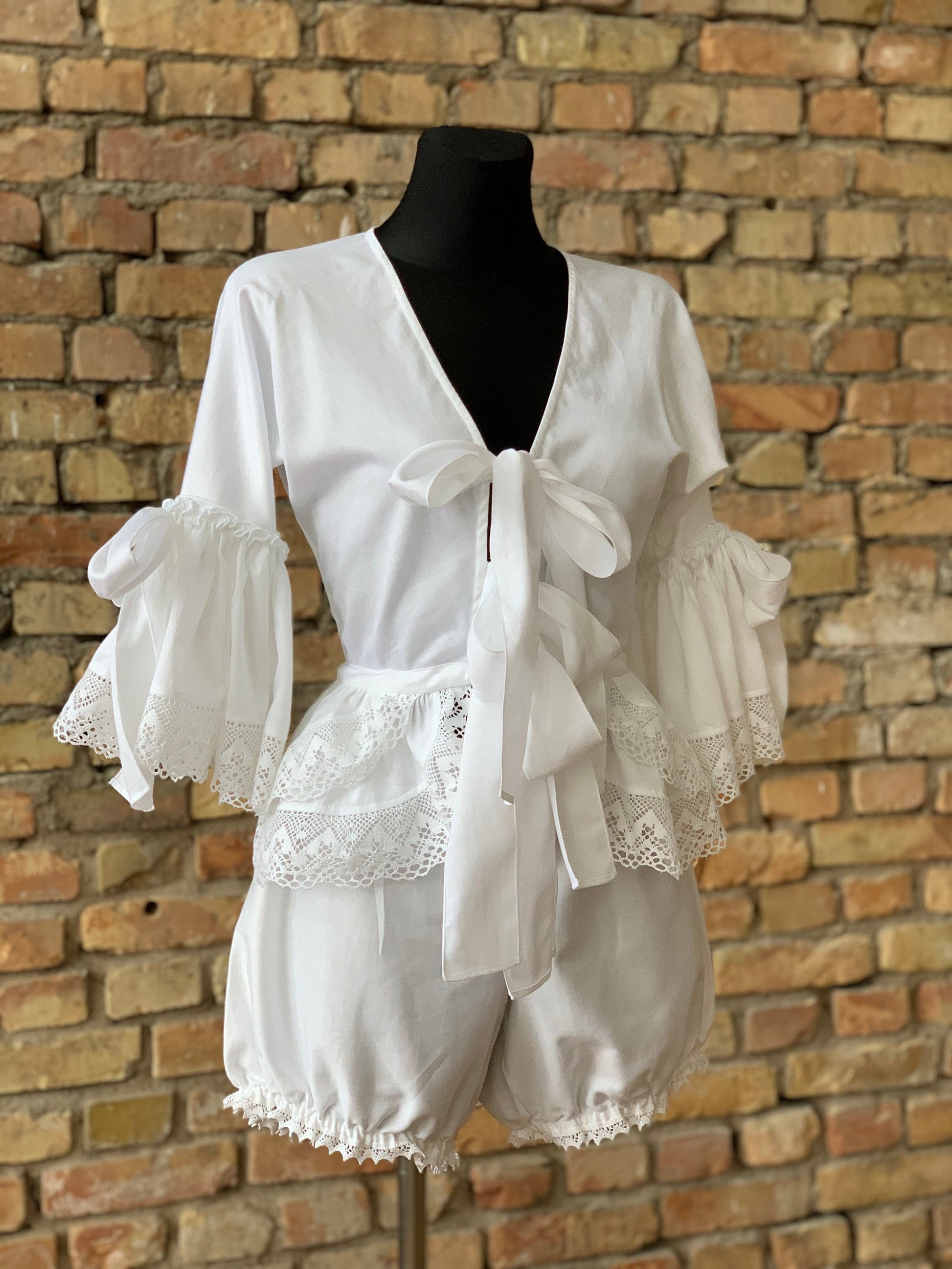 Made from soft silky cotton and decorated with lush cotton lace this lounge set radiates coquette femininity and romance. Designed to be fitted around bust and waist the top has adjustable closing with fancy bows at the front, ensuring comfortable fit. This cotton set it is elegant, full with ruffles, lace and bows - altogether glorious and cute.