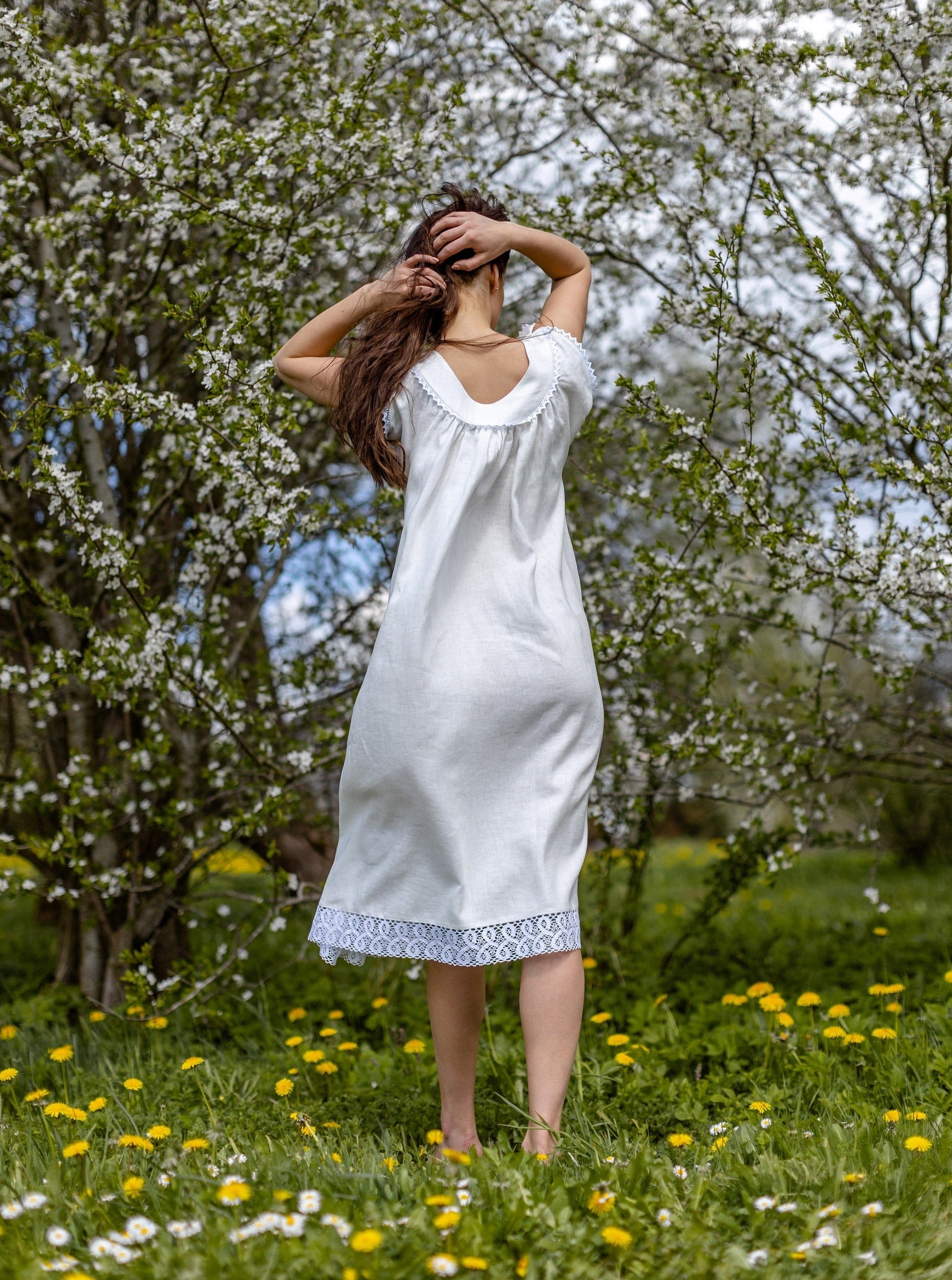 The original pattern of this nightdress from 1880's was found in a Latvian history museum in Vecpiebalga. We found that these kind of nighties were usually worn by young women from wealthy families living in the country. The soft and a little transparent white linen gives a feeling of abandon and lightness, making it just the perfect nightdress to embrace the summer. This nightdress will for granted bring the carelessness of a warm summer night in the country. Can you already feel the smell of a hay stack...?