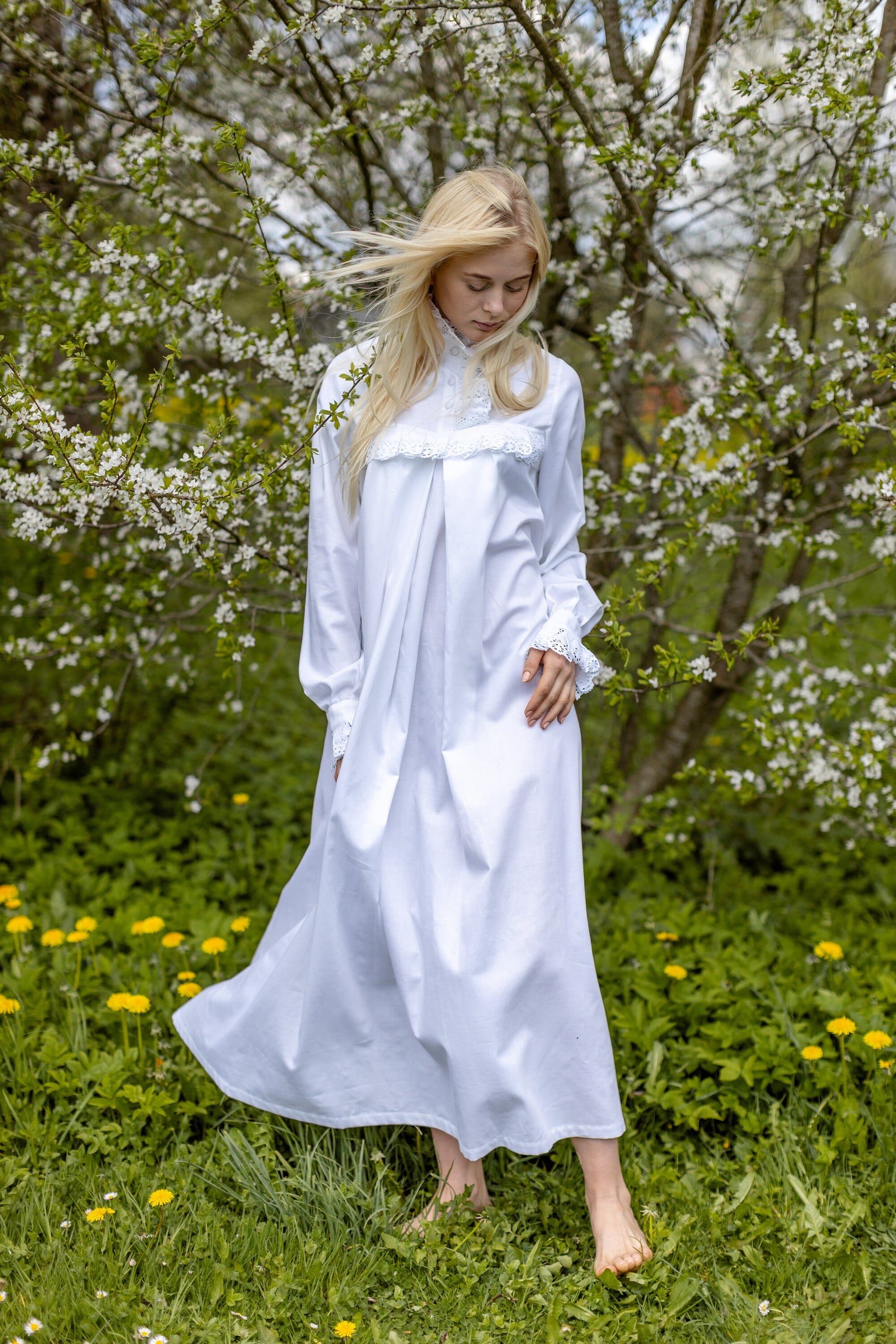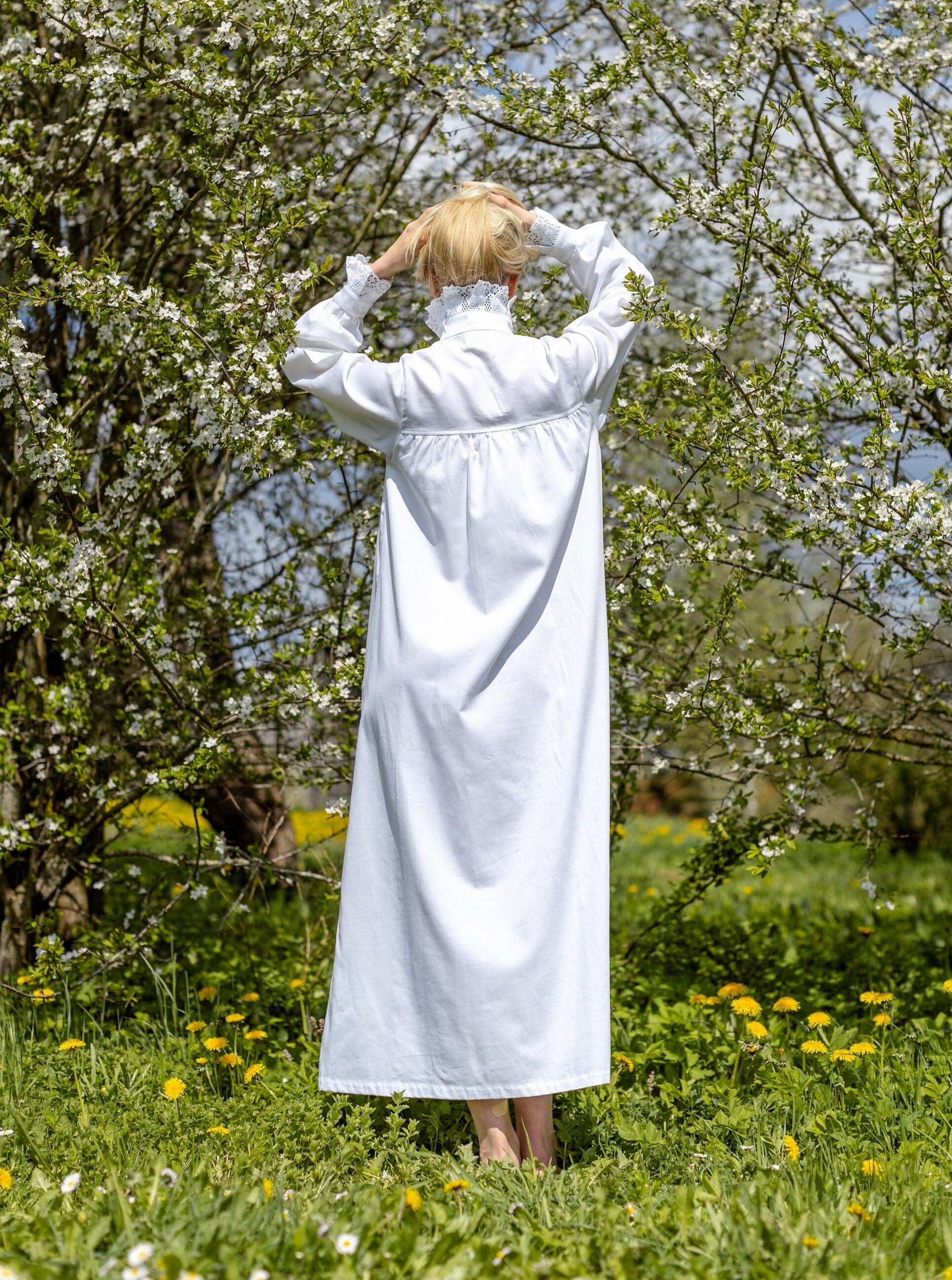 This beautiful soft nightgown was inspired by Victorian Edwardian times around 1900’s. In those days during the grim and long English winter evenings women retreated in the luxury and cosiness of their long cotton nightdresses. Enjoying their favourite book in front of an open fire they emanated intoxicating fragrance of subtle feminine beauty.